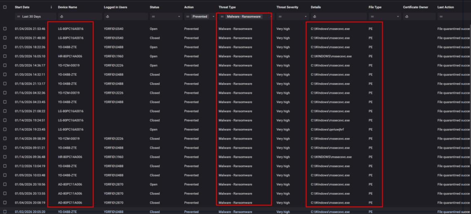 端點告警顯示多台設備偵測到「勒索軟體 / 蠕蟲」相關檔案,並成功處置(隔離/收斂)。